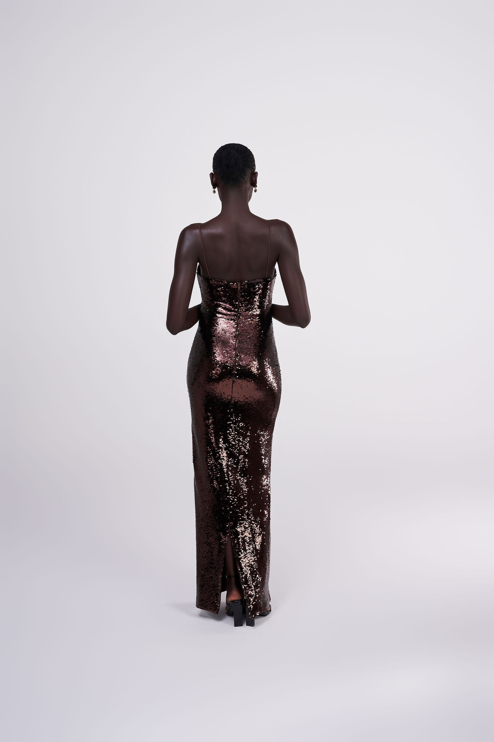 The GISELLE SEQUIN GOWN is a statement in silhouette and shine. Crafted in a rich chocolate brown hue, this gown sculpts the figure while commanding attention. A timeless piece designed to move with you and leave a lasting impression.