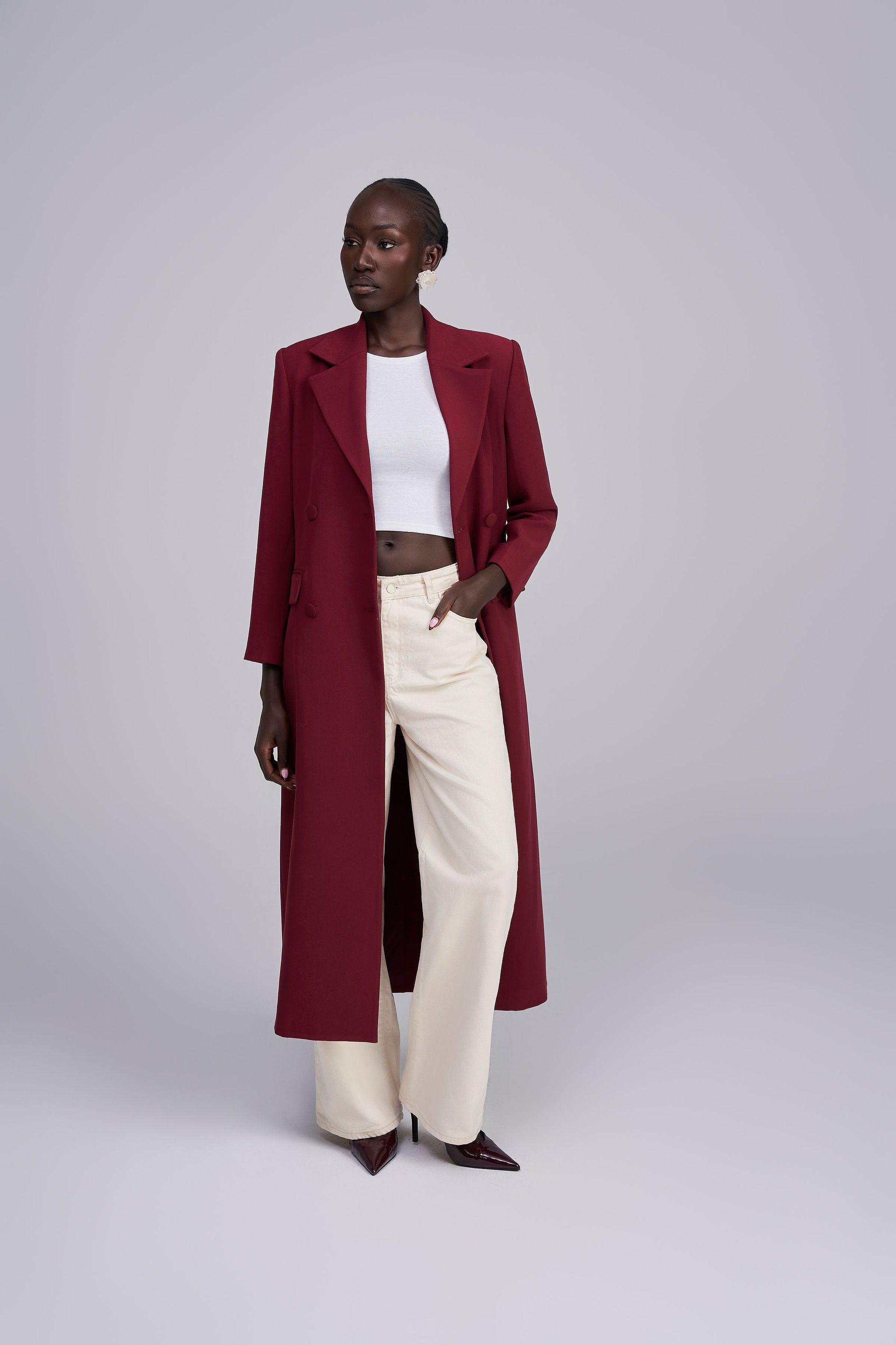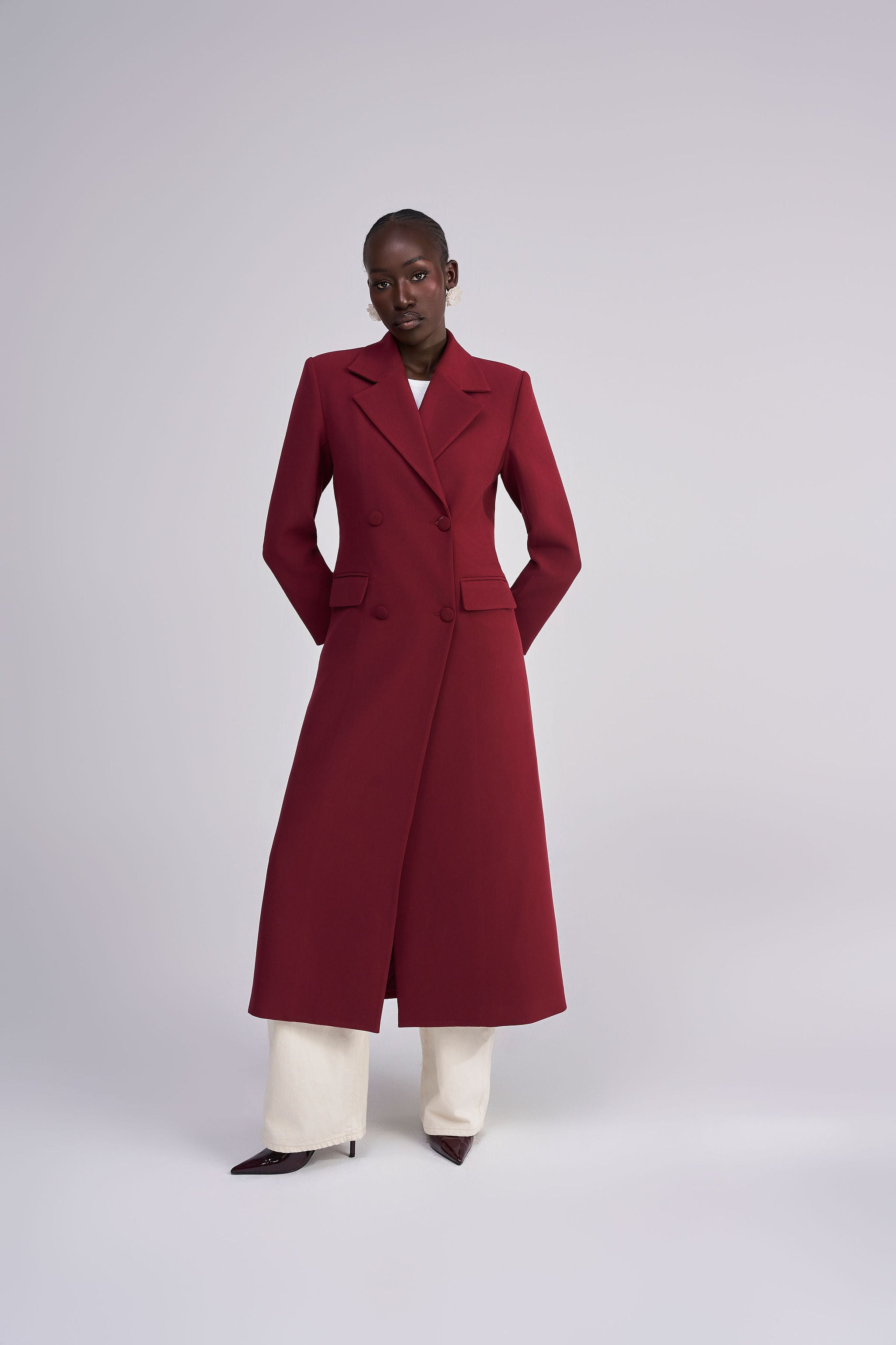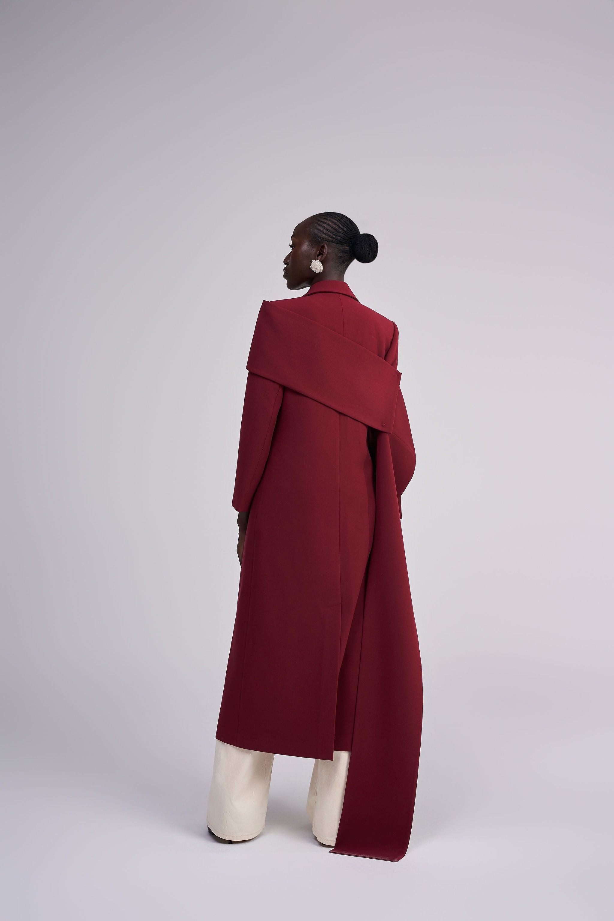 The MELANIA CAPE COAT redefines winter layering with elevated sophistication. Tailored in a luxe wine palette and sculpted with architectural precision, it offers bold structure and refined warmth. The detachable cape adds versatile drama whether worn on or off, making it perfect for a striking statement or minimalist elegance.